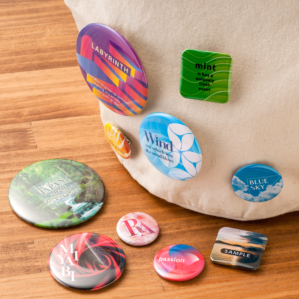 服や帽子はもちろん、トートバッグなどにつけても可愛い、小型の缶バッジ。缶バッジといえば丸型が多いため、形状だけでも印象度が高まります。ほぼ同サイズの丸型も展開、バリエーション違いでの製作もおすすめです。