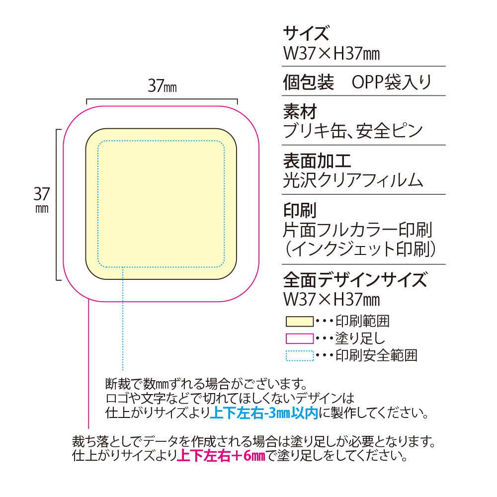 商品名 缶バッジ 角丸スクエア W37xH37mm 安全ピン サイズ W37xH37mm バックパーツ 安全ピン 包装 裸納品,OPP袋入,ヘッダー付OPP袋入,銀蒸着袋入,OPP袋+台紙有,ヘッダー付OPP袋+台紙有,OPP袋+シール有,ヘッダー付OPP袋+シール有,銀蒸着袋+シール有から選択可 印刷色 フルカラー印刷 印刷方法 レーザー(トナー)印刷,水性インクジェット印刷から選択可 テンプレート ダウンロード 素材 - 缶バッジ部分:ブリキ缶