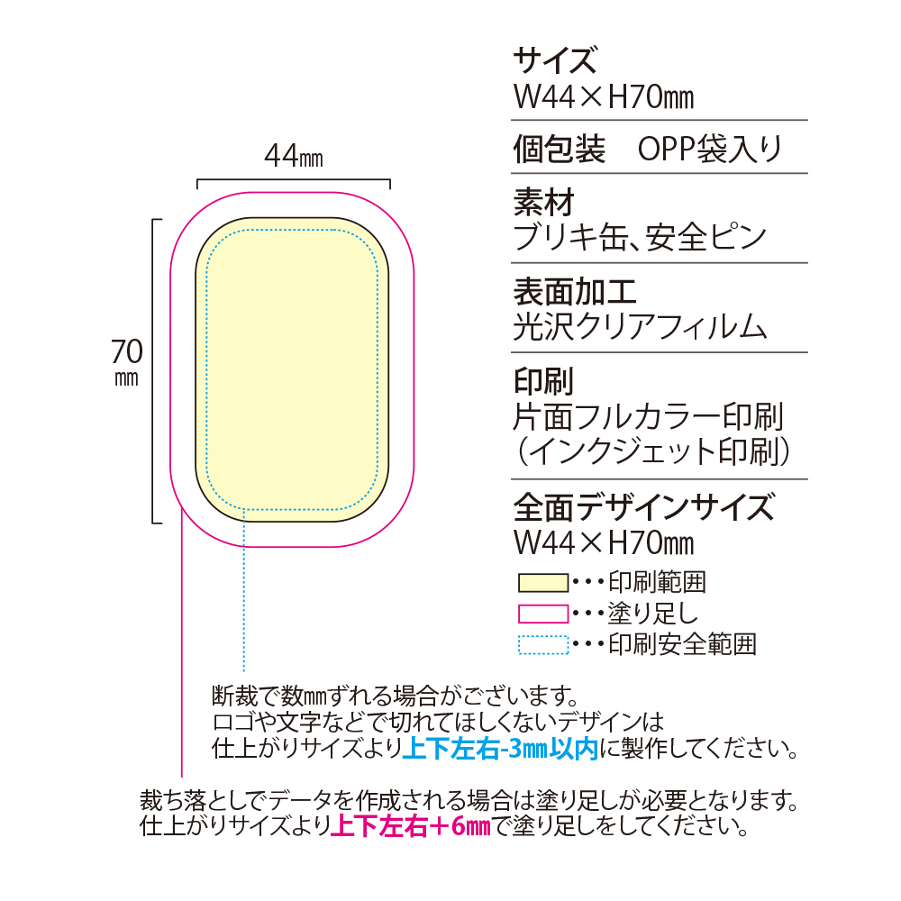 商品名 缶バッジ 角丸長方形[縦型] W44xH70mm 安全ピン サイズ W44xH70mm バックパーツ 安全ピン 包装 裸納品,OPP袋入,ヘッダー付OPP袋入,銀蒸着袋入,OPP袋+台紙有,ヘッダー付OPP袋+台紙有,OPP袋+シール有,ヘッダー付OPP袋+シール有,銀蒸着袋+シール有から選択可 印刷色 フルカラー印刷 印刷方法 レーザー(トナー)印刷,水性インクジェット印刷から選択可 テンプレート ダウンロード 素材 - 缶バッジ部分:ブリキ缶