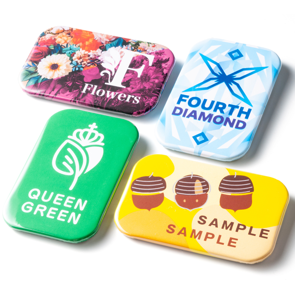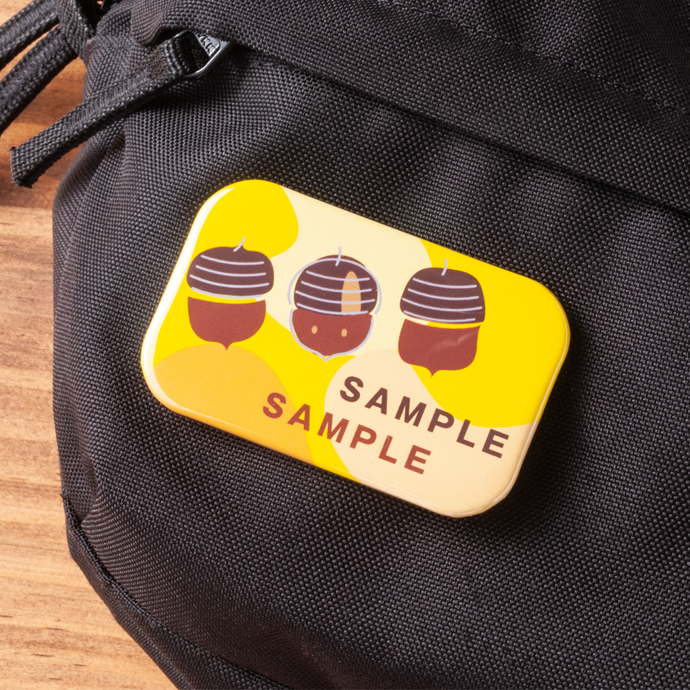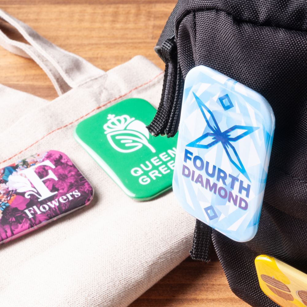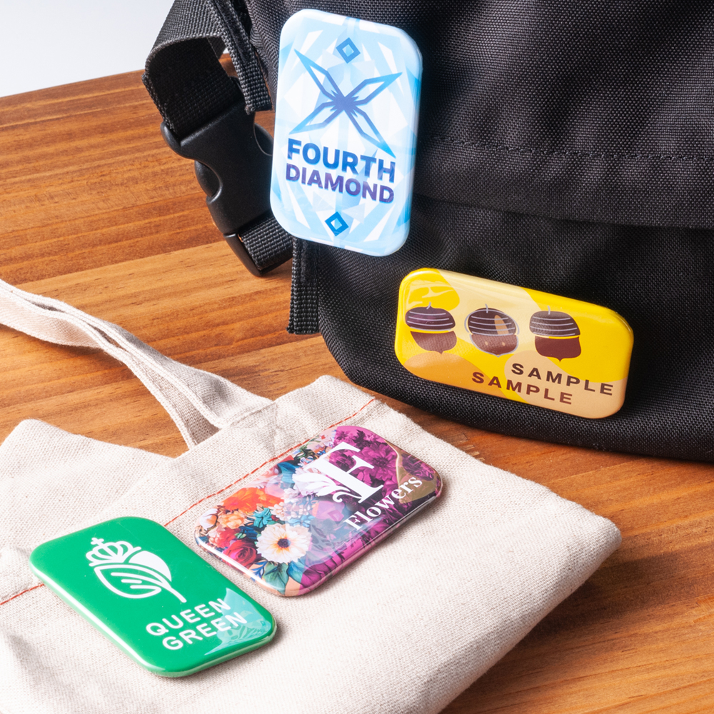縦長フォルムで視線をキャッチ!ロゴやイベント名をしっかり見せられるグッズ、角丸仕上げの安心缶バッジ