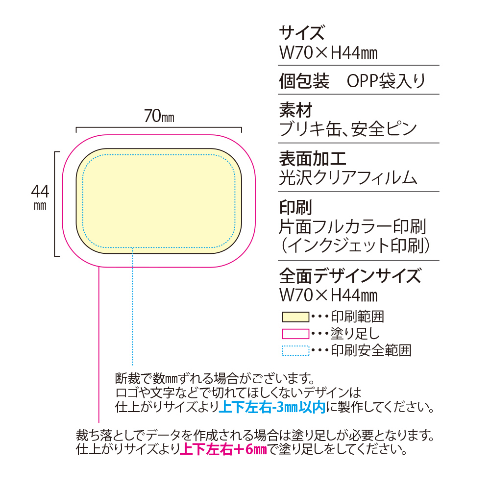 商品名 缶バッジ 角丸長方形[横型] W70xH44mm 安全ピン サイズ W70xH44mm バックパーツ 安全ピン 包装 裸納品,OPP袋入,ヘッダー付OPP袋入,銀蒸着袋入,OPP袋+台紙有,ヘッダー付OPP袋+台紙有,OPP袋+シール有,ヘッダー付OPP袋+シール有,銀蒸着袋+シール有から選択可 印刷色 フルカラー印刷 印刷方法 レーザー(トナー)印刷,水性インクジェット印刷から選択可 テンプレート ダウンロード 素材 - 缶バッジ部分:ブリキ缶