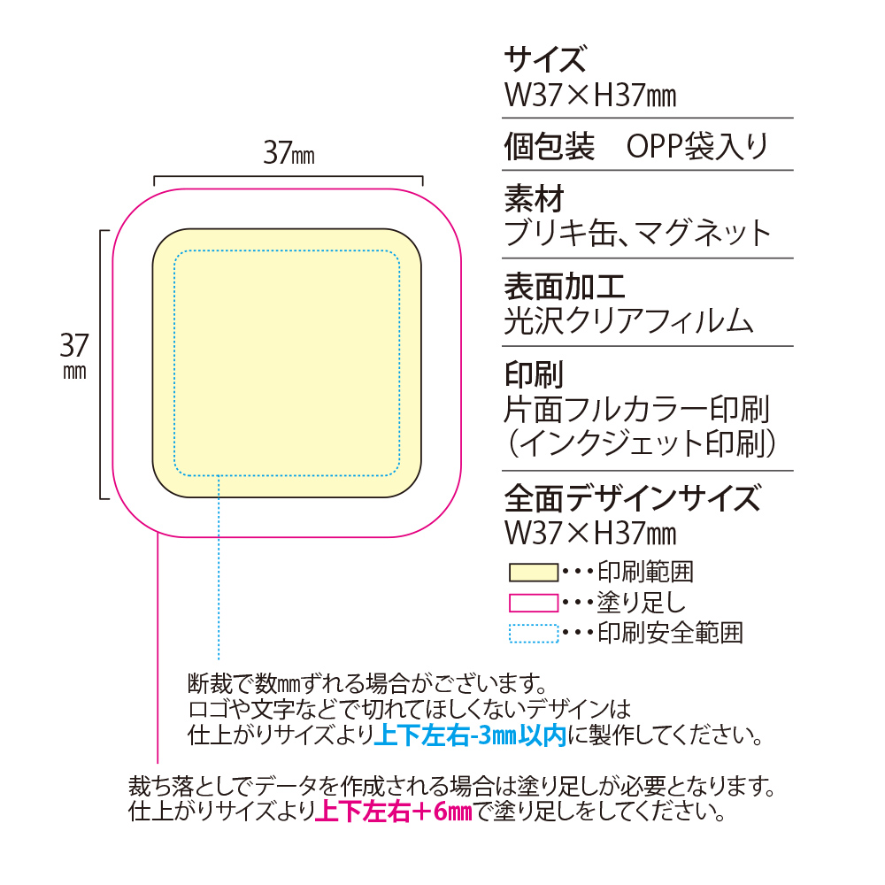 商品名 缶バッジ 角丸スクエア W37xH37mm マグネット サイズ W37xH37mm バックパーツ マグネット 包装 裸納品,OPP袋入,ヘッダー付OPP袋入,銀蒸着袋入,OPP袋+台紙有,ヘッダー付OPP袋+台紙有,OPP袋+シール有,ヘッダー付OPP袋+シール有,銀蒸着袋+シール有から選択可 印刷色 フルカラー印刷 印刷方法 レーザー(トナー)印刷,水性インクジェット印刷から選択可 テンプレート ダウンロード 素材 - 缶バッジ部分:ブリキ缶